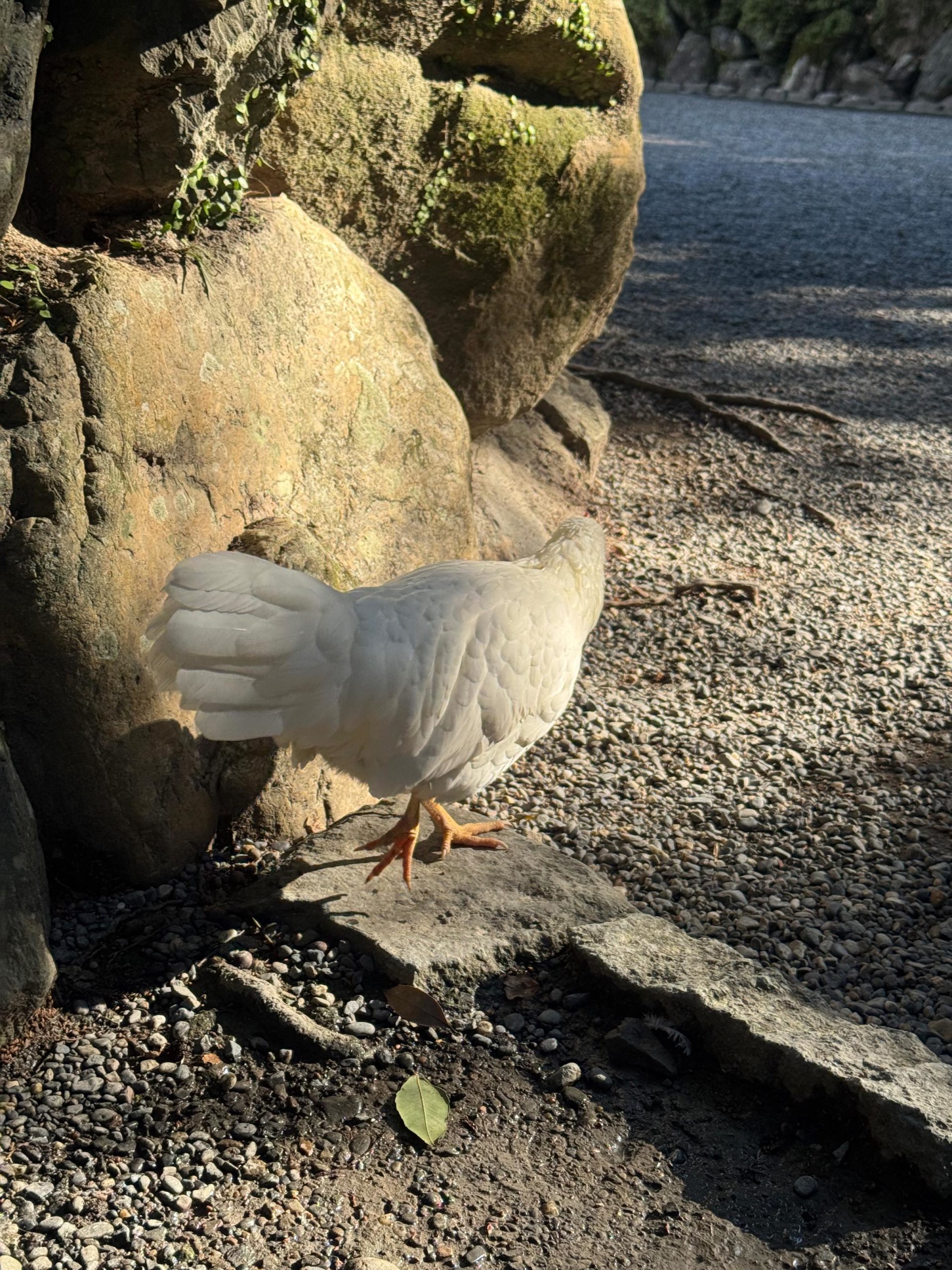 動物に出会うとラッキー! 伊勢神宮では、神様の使いとされる「神鶏(しんけい)」や白馬(神馬)に出会えると、神様に歓迎されているというジンクスがあるんです。この日は立派なニワトリさんが姿を見せてくれました。これは幸先いい!